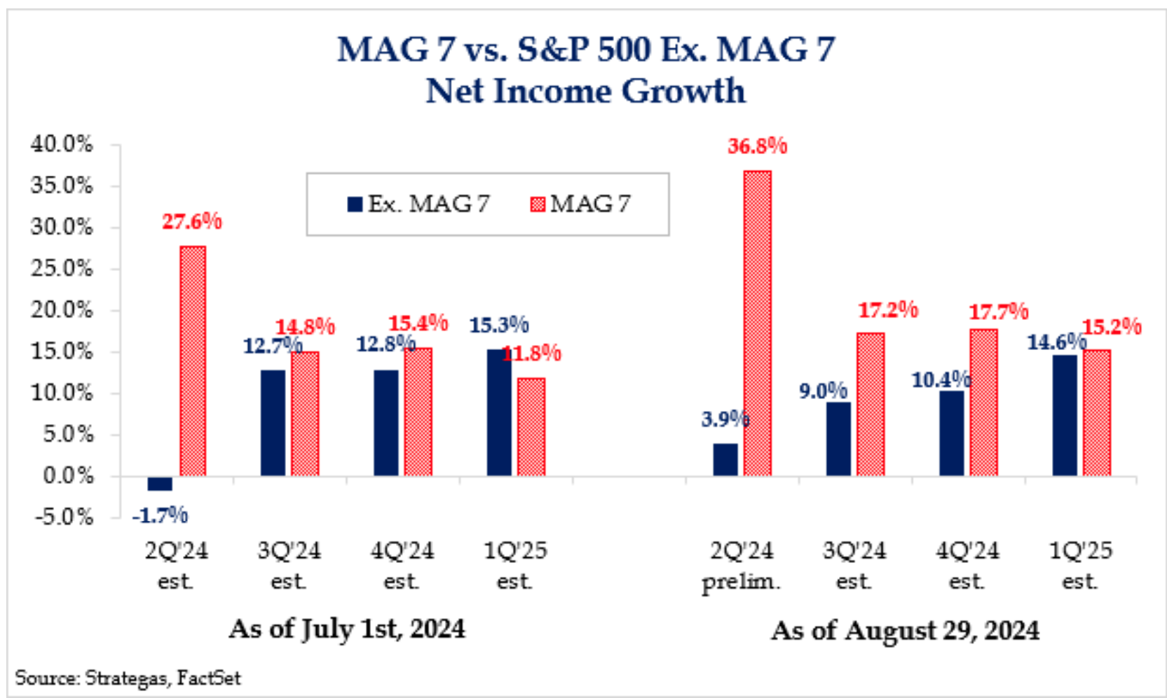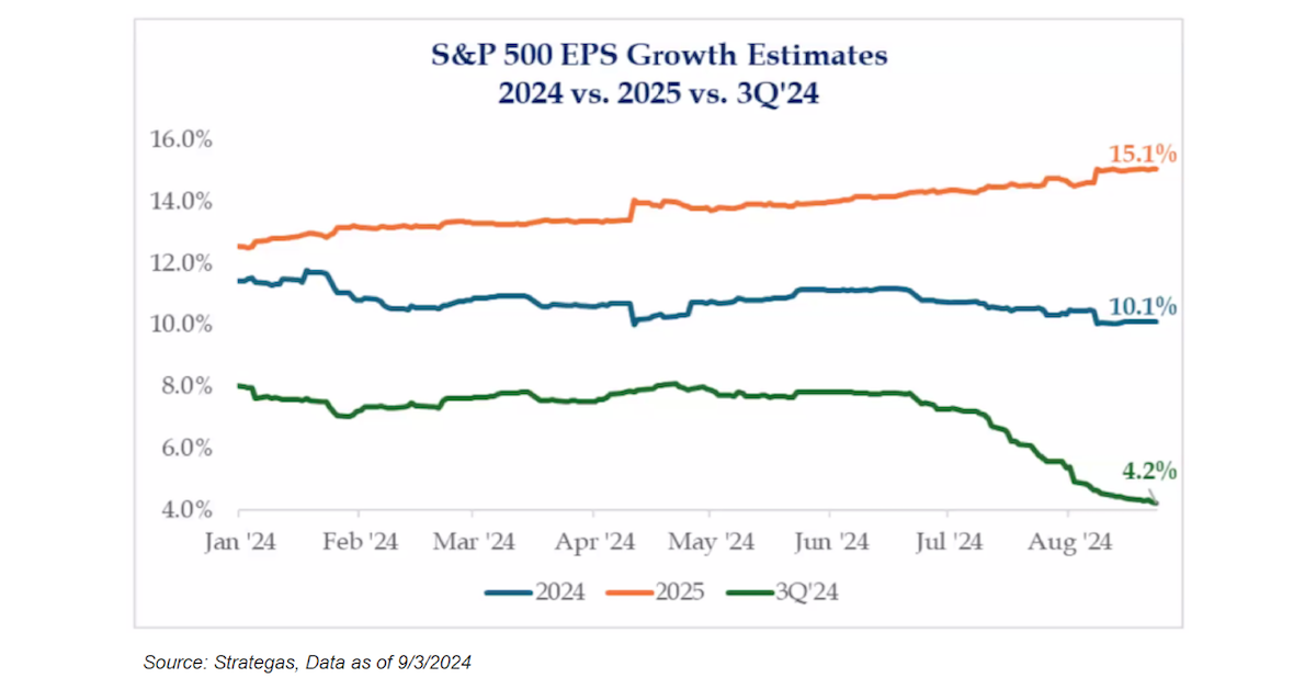 I’d characterized the earnings season by stating “widespread strength.” Year-over-year earnings are on track to grow 11% year-over-year (versus an expectation of 9% at the start of earnings season), with 56% of the S&P beating consensus earnings expectations by more than a standard deviation of analyst estimates (versus a long-term average of 48%), and earnings growth expectations for 2025 have been raised by 1% since the start of Q2