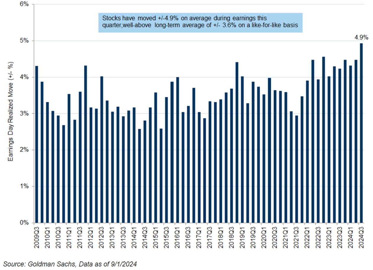 Throughout the entirety of Q2 ’24 earnings season, there have basically been no changes for earnings in 2024 and 2025. Yet, one of the most surprising facts of this past earnings season was that Q2 generated the biggest earnings day volatility since 2009. Personally, we think that says a little bit about where we are in the cycle, but also highlights the new phenomena of utilizing shorter-dated options.