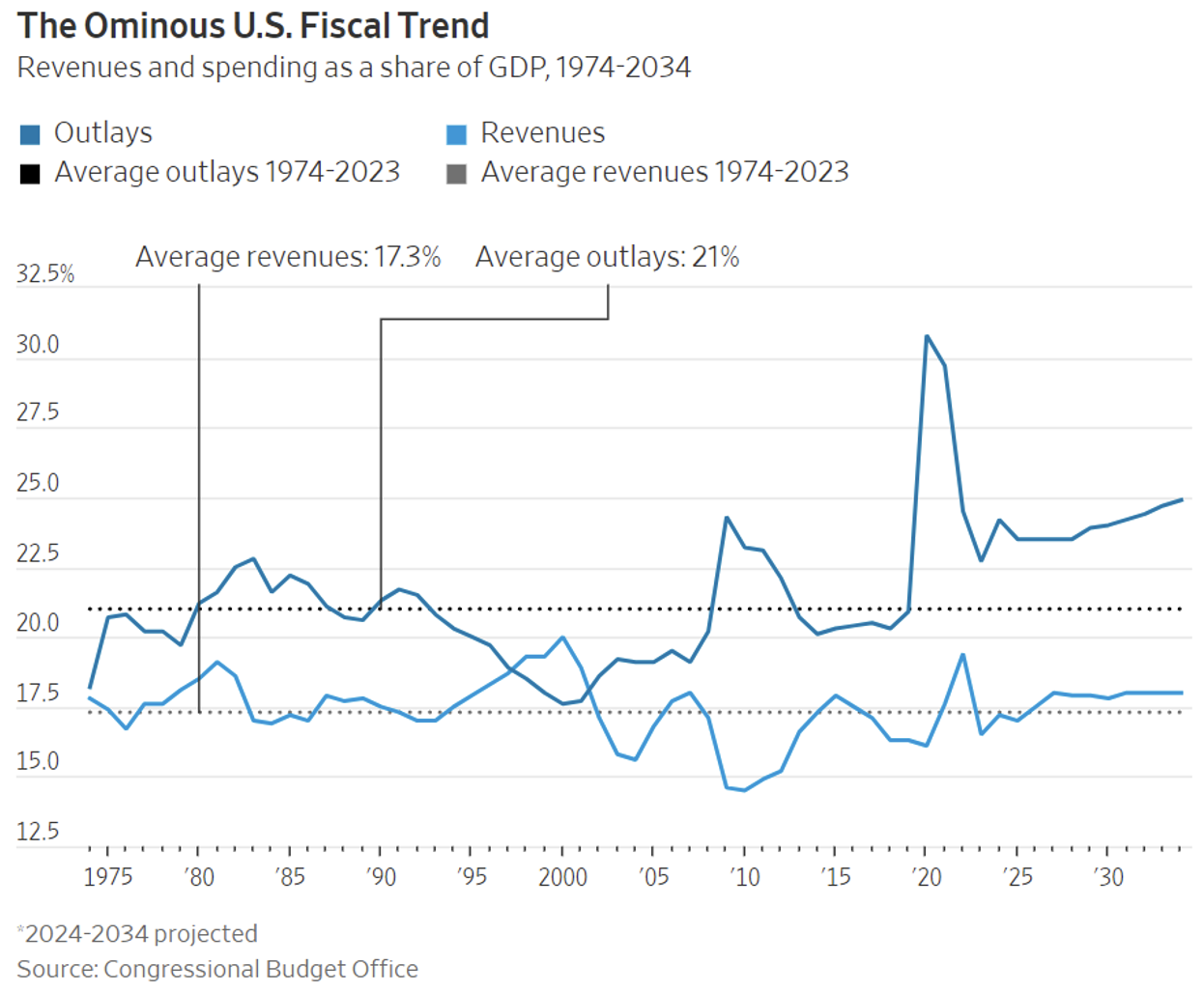These numbers are hard to fathom given the strong economy and relatively flat defense spending. The deficit this fiscal year will be 7% of GDP, which is more than during some recessions. CBO says deficits will stay nearly this high for years, and the total over the next decade is now expected to total $21.9 trillion compared to $19.8 trillion in its February forecast. Debt held by the public will grow to 122.4% of GDP in 2034 from 97.3% last year.