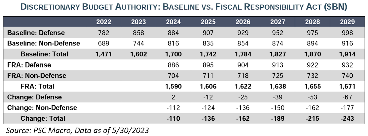 Honestly, this bill was status quo – the policies that account for most of the deal’s fiscal effects likely would have come about in any case. Roughly flat discretionary spending over the next two fiscal years already looked likely in light of the divided Congress, as Republicans were unlikely to agree to an increase for the coming fiscal year, and a restart to student loan repayment this fall also looked more likely than not.