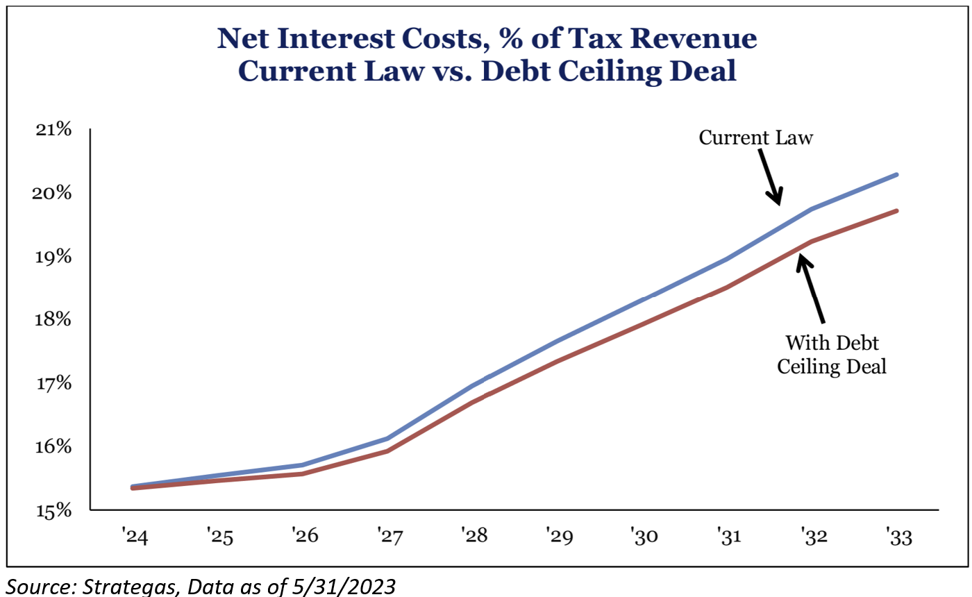 With the NBA finals beginning, let’s heed some wisdom from the NBA G.O.A.T., Michael Jordan, who once said that the ceiling is the roof. Unfortunately, that wisdom proved to be wrong. Over the weekend, President Biden and Speaker McCarthy unveiled their compromise legislation to raise the debt limit through January ‘25 showing the market that the $31.4T debt ceiling was in fact, not the roof.