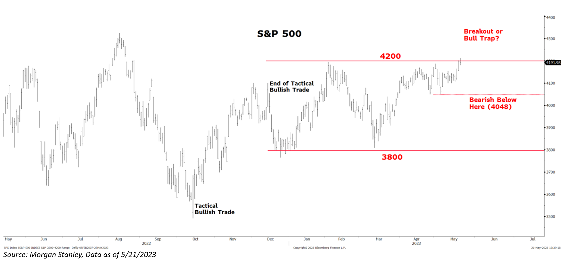 With the S&P 500 testing the upper end of its trading range (3800-4200), are we on the cusp of a breakout that confirms a new bull market or a reversion to the mean? I believe that the debt ceiling remains a key risk even if a deal is made. Nonetheless, time will tell.