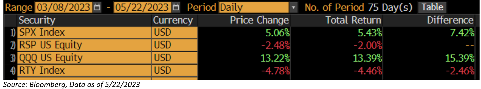 Since the bank failures began on March 8, stock returns of individual companies within the S&P 500 have shown a significant divergence. The total return of the market cap weighted S&P 500, or the SPX, is up 5.43%. But on an equal-weighted basis (RSP), these same 500 stocks are down 2.00% over the same period.
