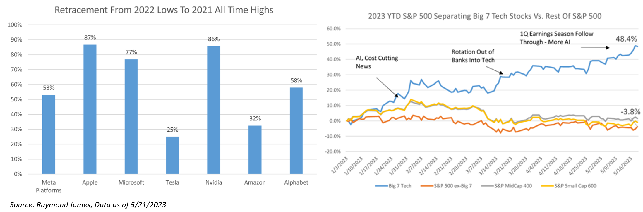 By our estimates, the Big 7 tech stocks have contributed 13% to YTD performance on the S&P 500, while the rest of the index is down ~4% on average, a spread that seems to widen nearly every week (how narrow can we go?).