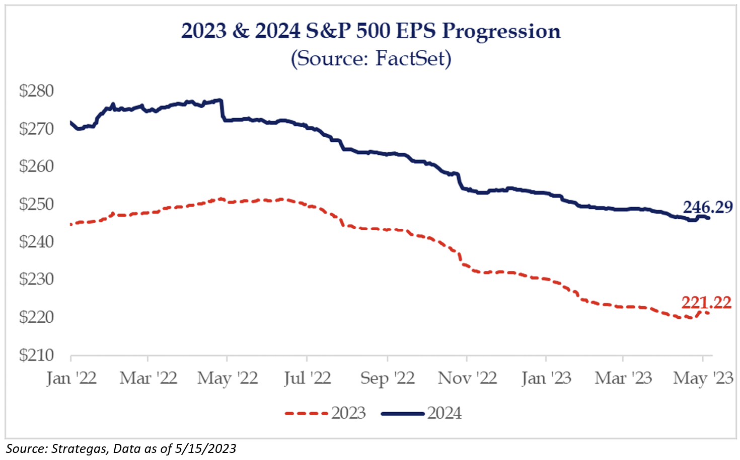 Q1 ’23 EPS tracked 5% better than Wall Street analysts expected, though down 3% YoY. Of that, 71% of companies beat on sales, 77% on earnings, 58% on both, handily clearing the long-term averages of 58% / 59% / 40%. At the beginning of the year, Q1 EPS expectations were thought to contract 8% YoY, reflecting reduced concerns about downside risk.
