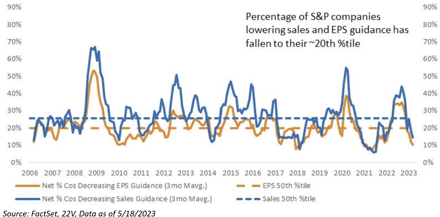 One of the most surprising things during earning season was the strength of corporate guidance. There have been 40% more above- than below-consensus guides this season (April-May), the 3mo guidance ratio is tracking 1.4x, the strongest in two years and well above the historical average of 0.9x.