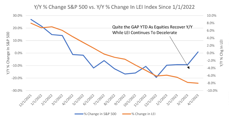 If y’all have heard me speak lately, I keep using the phrase “deceleration”, and one of the more interesting charts I’ve come across lately is below. The LEI index for April decelerated yet again to -8.0% YoY with little signs of stabilization. Of note, the LEI has one of the highest R-squareds of any economic data sets we have tracked over time (44%), meaning it’s relatively unusual to see equities increasing YoY when this metric is declining and worsening YoY.