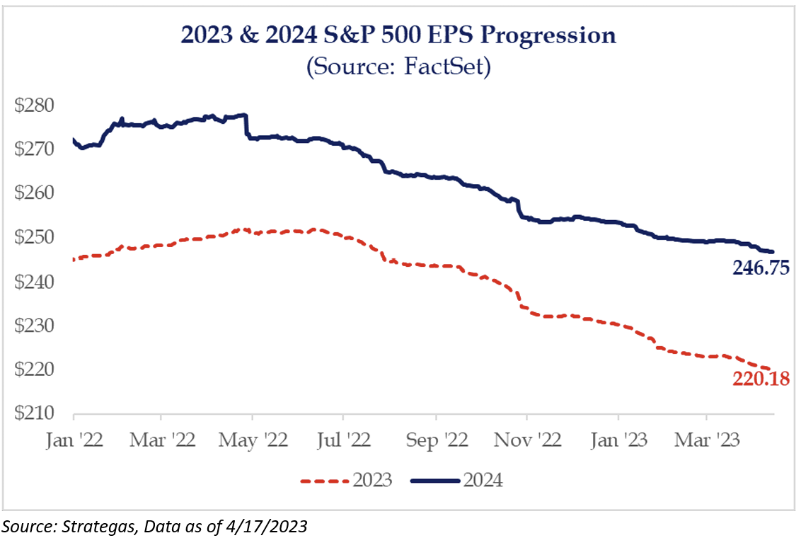 The last 3 earnings seasons have seen relief rallies in equities as EPS weakness was not as bad as feared. Earnings growth for FY ‘23 is now expected to be flat, down to $220, in line with 2022 EPS. The 2024 estimate is garnering more attention in our book as the street still has growth of greater than 10% v. ‘23. A resetting of expectations during this upcoming earnings season could result in this figure being revised lower, but, as of now we would take the 2024 consensus estimate with a grain of salt.