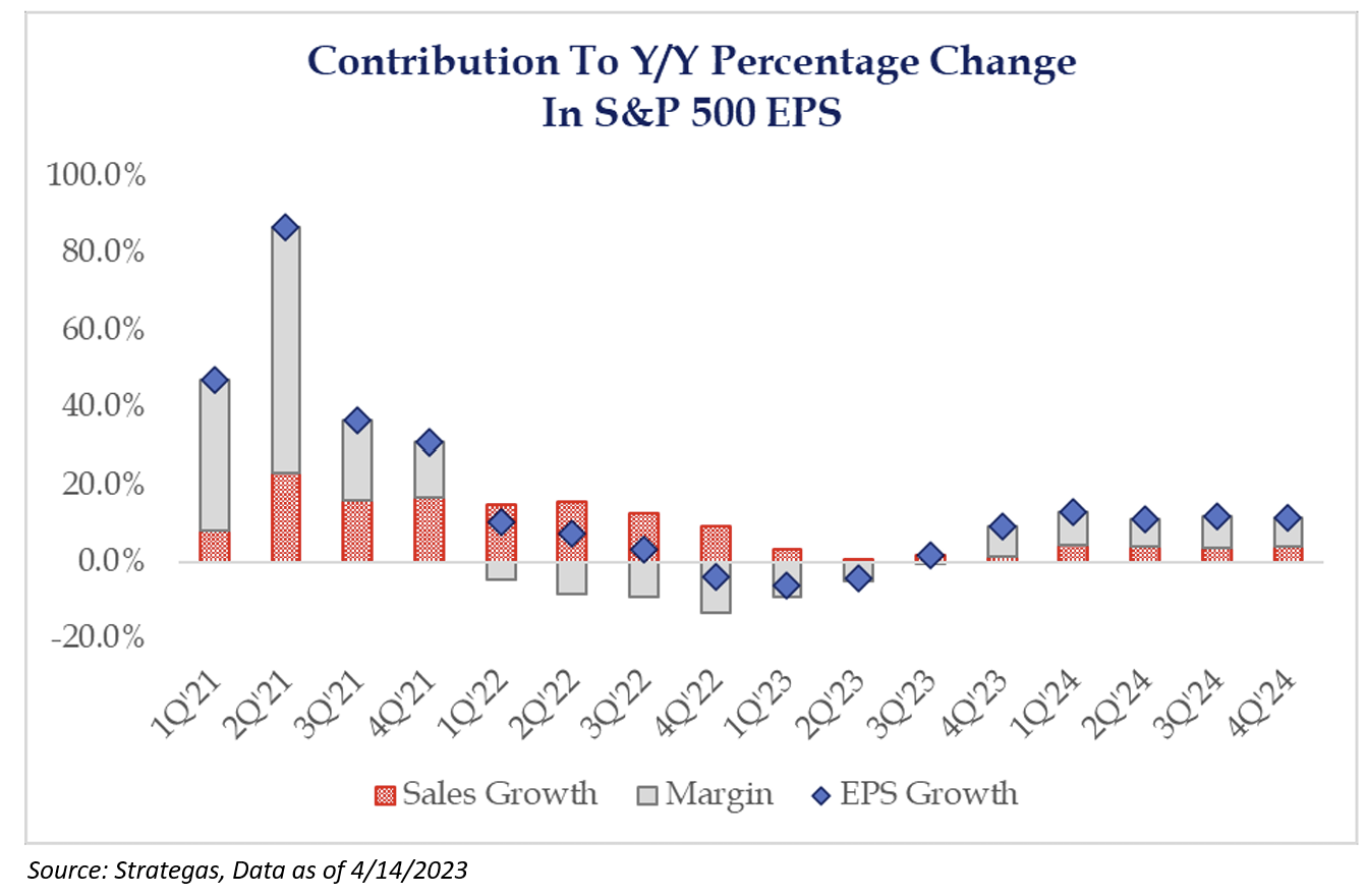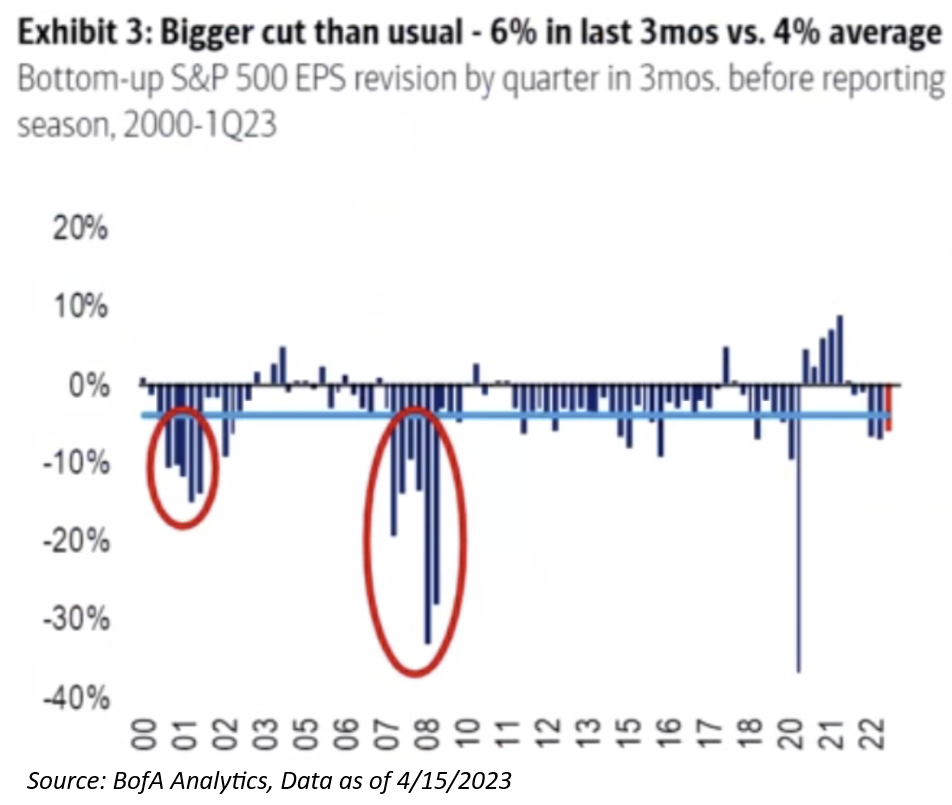 S&P 500 Q1 ’23 consensus EPS has already been cut by 6% YTD to $50.70 (-7% YoY), more than the average -4% pre-season cut. Macro indicators started the year strong but slowed after SVB news. Basically, there were two strong months of economic data (January & February), and then one month of slowing data (March). Thus, Q1 EPS may be more insulated than anticipated. But this quarter should not be about first quarter results – investors should focus more on guidance and commentary.