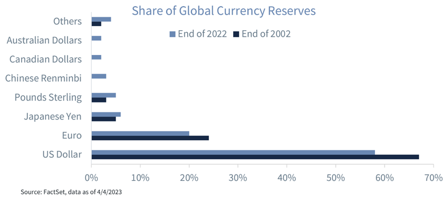 After the recent mini-banking shock in the U.S. and subsequent liquidity provisions, the dollar’s global reserve currency status has become a hot topic (again – the dominance of the U.S. Dollar has been challenged for decades). Additionally, the moves by some emerging market countries, including China, to settle trade flows in local currency and avoid the need for dollars has added fuel to the fire.
