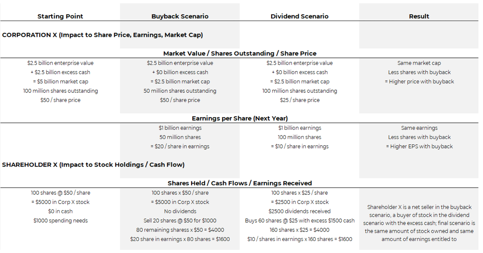 Let’s illustrate this with a hypothetical example of Corporation X, which can either return excess capital via buybacks or dividends: