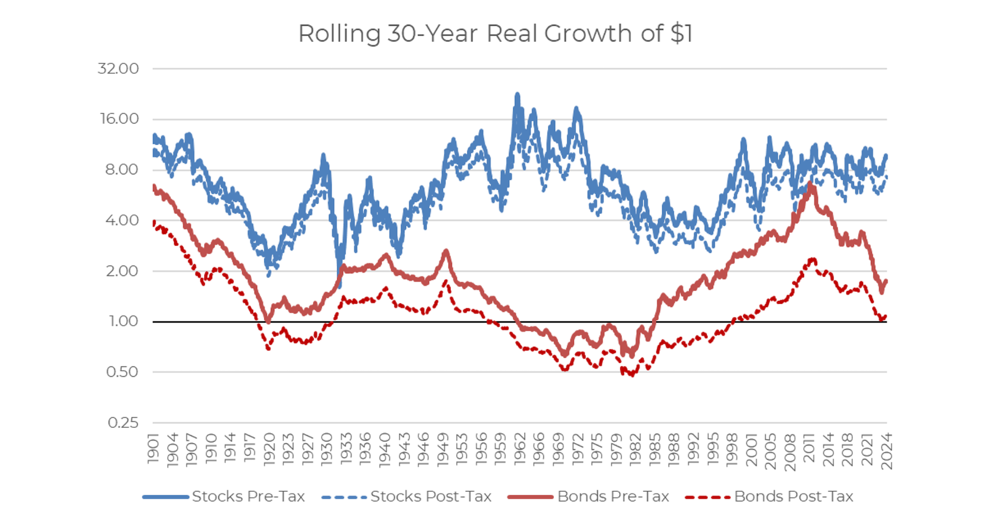 Let’s start with a surprising truth: over the long term, stocks have historically been the more reliable store of value, not to mention a superior wealth builder, than bonds. This may go against your instincts or what you’ve heard from financial experts, but the data is clear. For more than 100 years, stocks have consistently outperformed bonds when viewed over extended periods, offering higher returns, especially after accounting for taxes and inflation, with less dispersion of those returns.