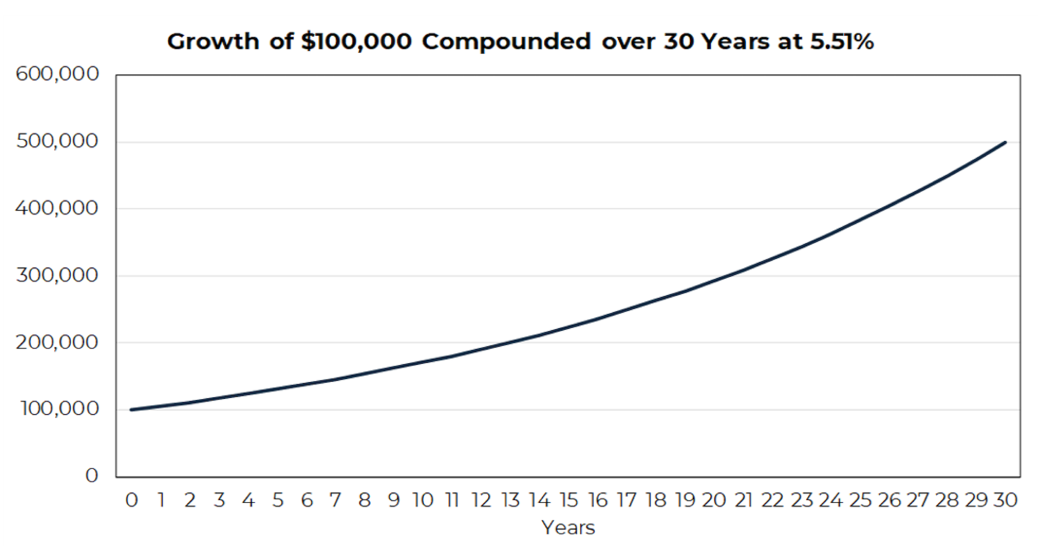 Let’s crunch the numbers. To calculate the return (IRR), solve for the rate (X) that equates the initial investment to the future value: $100,000 × (1 + X) ^ 30 = $500,000