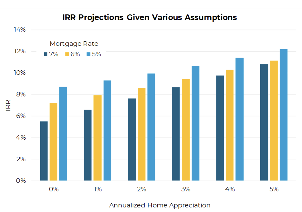 - Home Appreciation: If the home appreciated by just 3% annually (the lowest 30-year price increase for a median home since the 1960s per the Federal Reserve), the IRR jumps to ~8.6%.