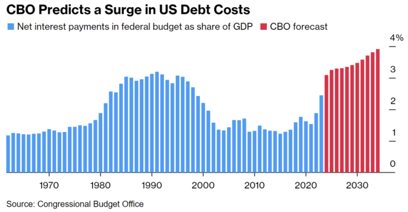 “Net Interest payments will climb to 3.1% of GDP next year, the highest level in records going back to 1940, and then go on to hit 3.9% in 2034.” CBO Director, Phillip Swagel, said in a statement.
