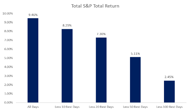 For example, while we know there will be big moves in markets, we cannot predict when catalysts for that change will take place. Managing risk by attempting to time the market can significantly impact how you compound capital. Missing out on positive days by being “risk-off” is a good way to introduce another risk to the equation: longevity risk.