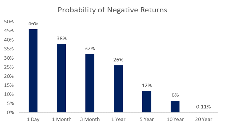 When you exit the market, you may miss some of the downturn (if you get that timing right), but with that, you have the potential to add other risks. By spending less time in the markets you’re increasing your probability of negative returns. As shown below, the more time you spend in markets the lower the probability you have that your returns are negative in the long run.