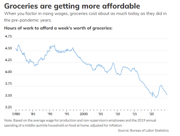 Brian: By one measure, the long downtrend of grocery bills relative to income has resumed after the 2021-22 spike