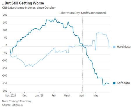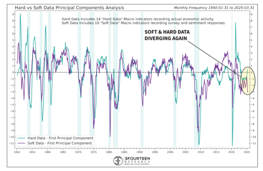 Joseph: Since Trump’s “Liberation Day” tariffs on April 2, soft data (like surveys) has collapsed, while hard data (like jobs and spending) hasn’t budged. It’s a reminder that sentiment often reacts faster than the economy actually does—if it reacts at all.