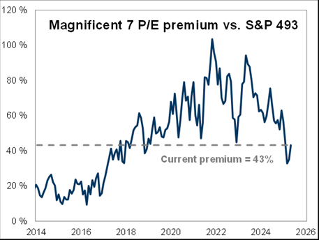 Brad: Yet the MAG-7 premium in relative terms compared to the rest of the S&P 500 has dropped to 43 percent, the lowest since 2017. Still higher, but justified?