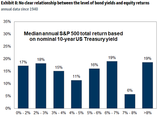 Brad: There’s no magic interest rate that kills equity returns. Since 1940, S&P 500 returns have shown no consistent pattern based on nominal yields.
