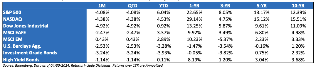 What Caused the Recent Pullback? Stocks dropped this past month – the first official pullback of 2024 (-4.1%) on higher yields, hawkish Fed rhetoric, and mixed earnings results that are leading nervous investors to turn not just cautious, but potentially negative. Despite the pullback in stocks, however, the outlook for stocks hasn’t really changed that much at the end of April. What has changed is that investors no longer have unrealistic expectations about steadily falling inflation, near-term Fed rate cuts, and, to a much lesser extent, impervious earnings.