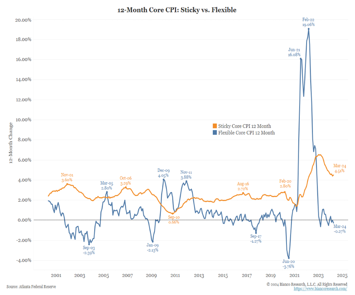The flexible components of core CPI have been in deflationary territory over the past year (blue line in the chart below). The stickier components of core CPI, however, are still running well above their pre-pandemic average (orange line).