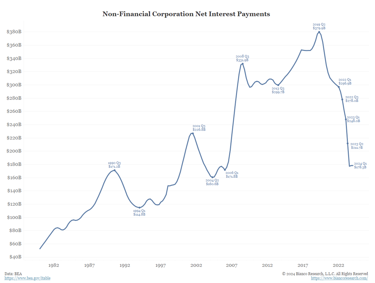 The graphic below shows the total non-financial corporations’ “net” interest expense since 1980. Interest expense rose in the zero-interest rate period after the 2008 financial crisis where it peaked at $379.9 billion in Q2 2020.