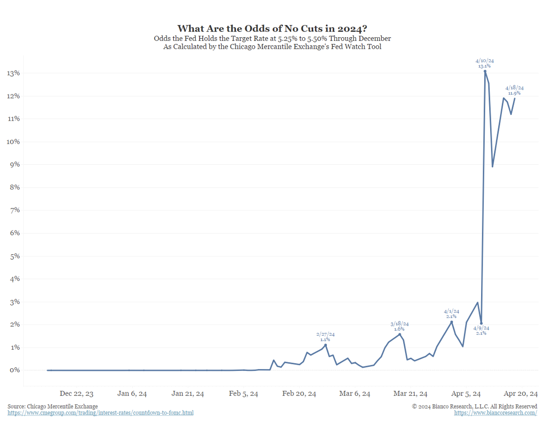 As we stand now, the idea of no cuts in 2024 is gaining steam. We are currently sitting at about a 12% chance for zero rate cuts this year. If the data (growth and inflation) continues to surprise toward the upside, we expect the chance of no rate cuts to push higher.
