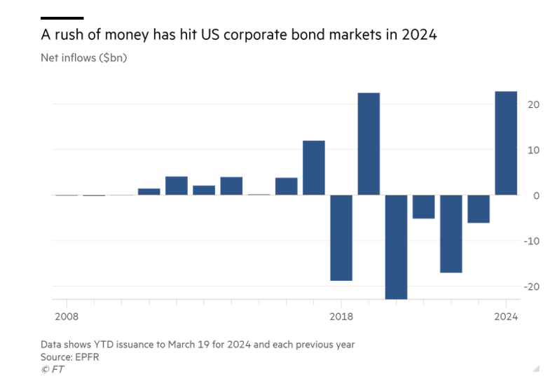 2024 has brought a large inflow into corporate bond funds which has totaled ~$22.8bn thus far, according to fund tracker EPFR.