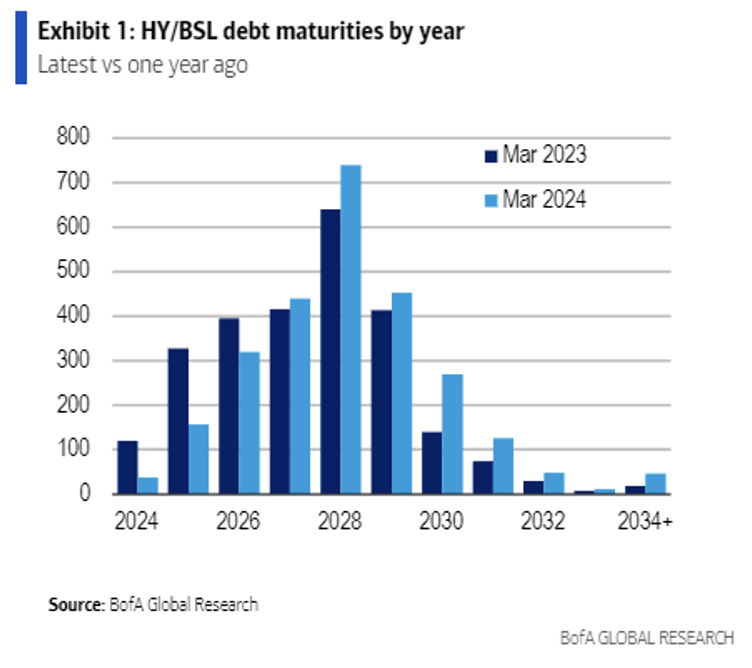 Bank of America labeled the change as “This episode represents one of the most aggressive instances of maturity extension in the history of leveraged finance.” Narrow credit spreads have enabled these companies to refinance the debt at a modest 200bps increase in cost versus the 500bps cost speculated by many. While some issuers may face issues if rates stay elevated, the maturity wall was “less tall” than most expected.
