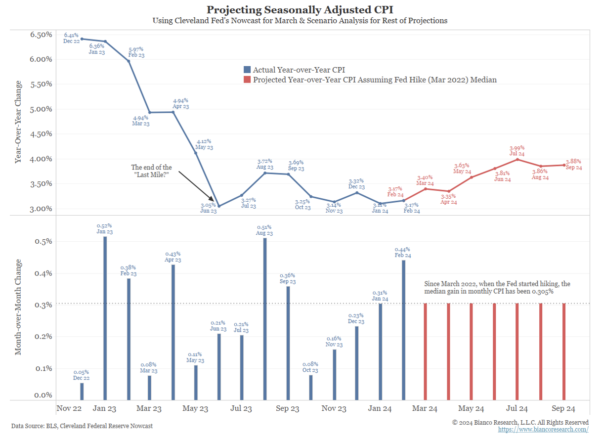 Bianco Research analyzed what that could look like moving into Q2 and Q3. The red bars in the bottom panel project a 0.305% month-over-month growth rate for CPI, which was the median monthly CPI gain over the last two years. The red line in the top panel shows what year-over-year CPI will average if monthly CPI continues around the median monthly gain of 0.305%. As you can see, it’s much higher than the Fed’s 2% target.