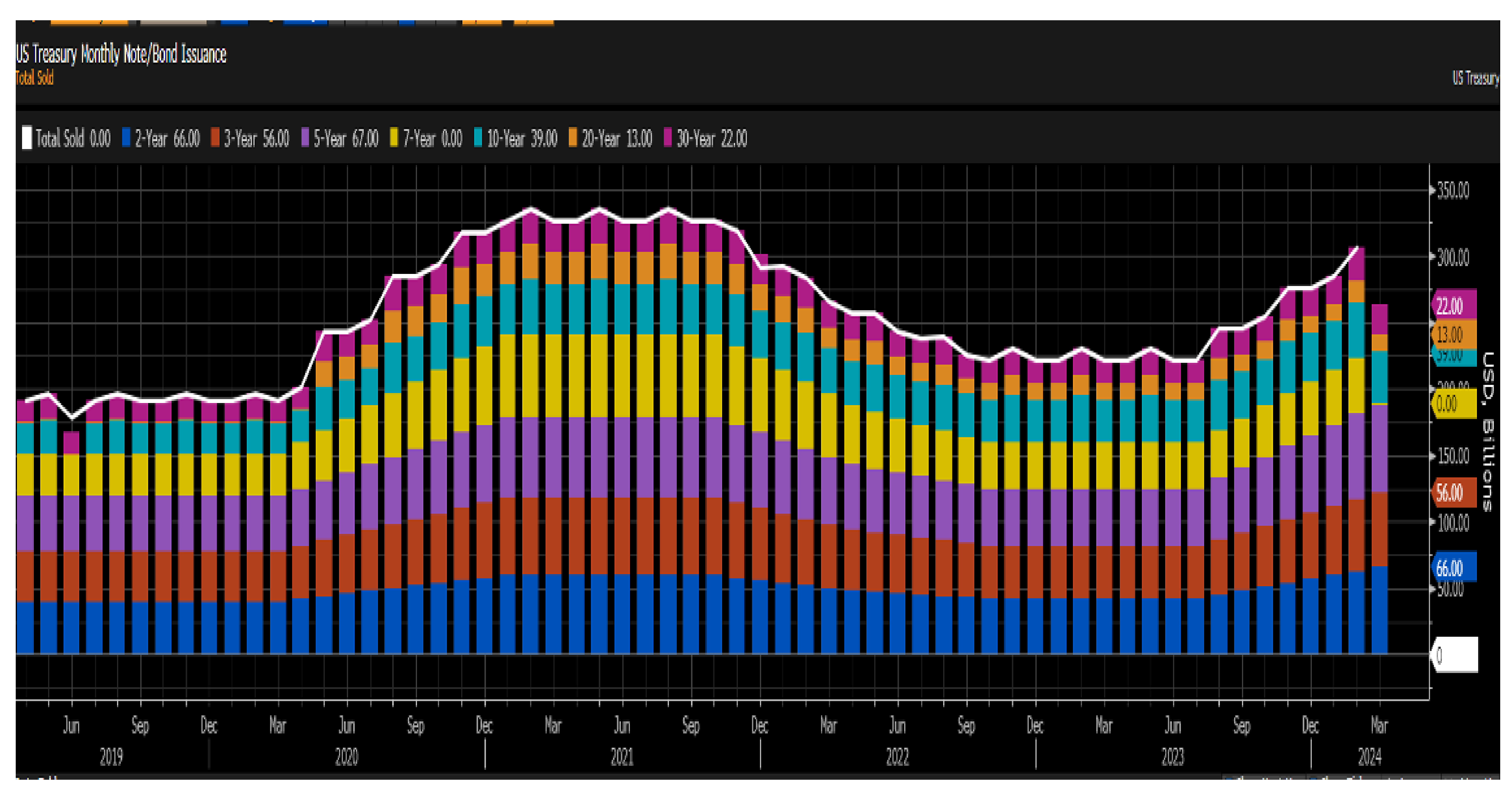 We agree that there are three options at this juncture: cut entitlements (unlikely), cut defense spending (very unlikely), or allow real inflation to run greater than interest rates in the form of financial repression (likely). Looking at Treasury issuance data, we’re seeing issuance back to levels seen during the pandemic. While a chunk of recent issuance has been focused on the front end of the curve (where there is ample demand), at some point this debt (plus new debt) will have to be rolled out further on the yield curve.