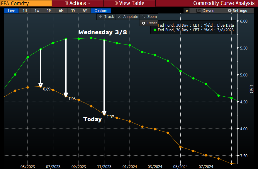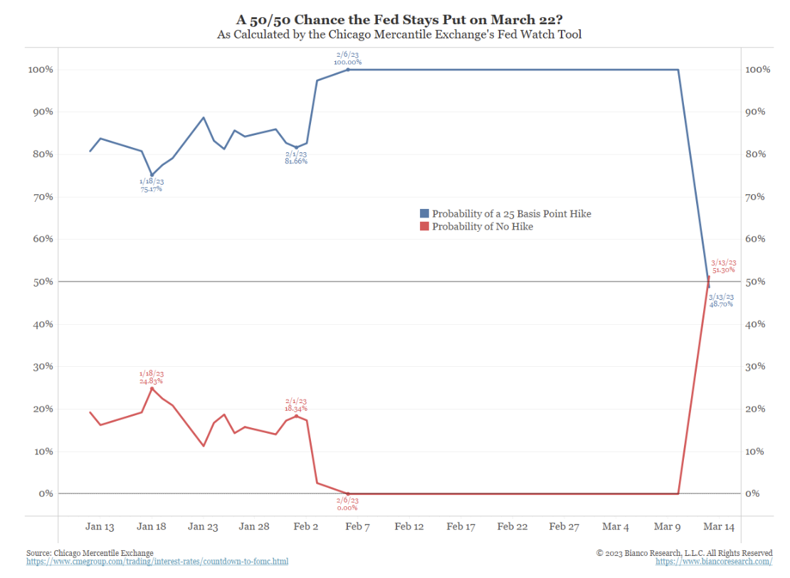Just Last week, the debate was whether the Fed would hike 50bps or 25bps at the March 22 FOMC meeting. Now, the question is whether they hike 25bps or pause. Currently Fed Funds futures are pricing in just a 65% chance of a 25bps hike. That’s quite the change in a few days but, given the backdrop, is understandable.