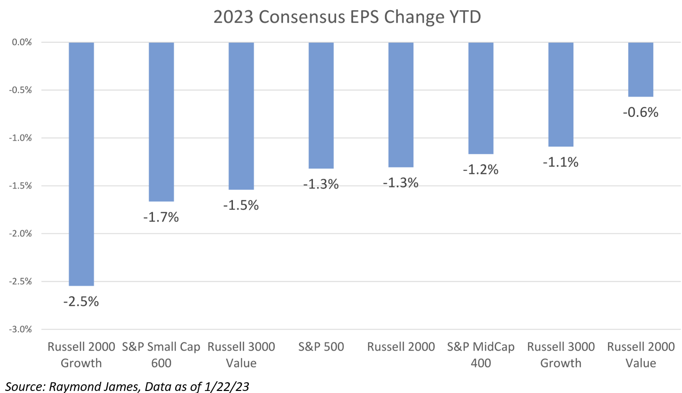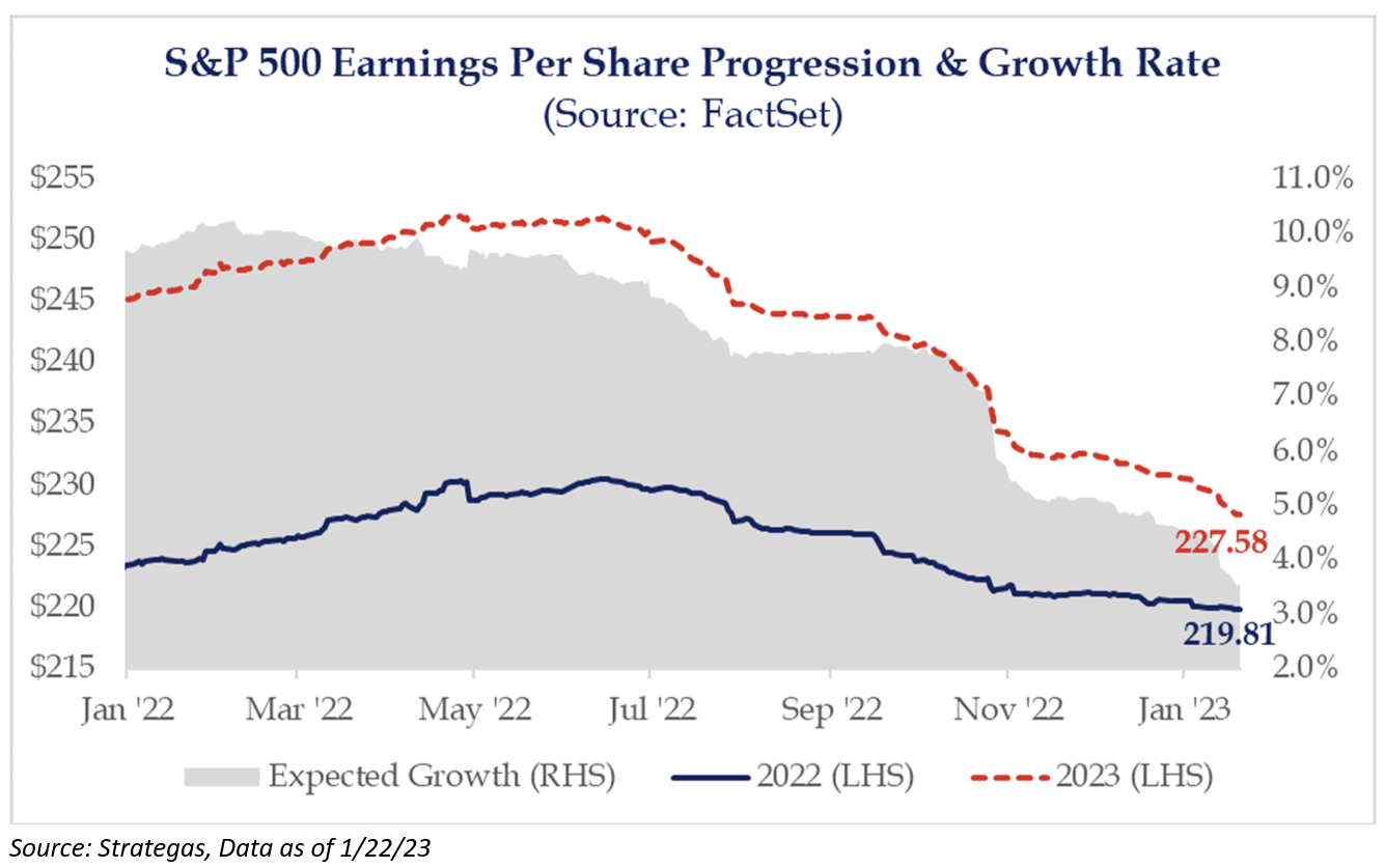Looking at the full-year 2023 sales estimates shows that expectations are being reset lower on both the top and bottom line. Sales growth for the year is now expected to be 2.5%. What’s important is that this growth rate is expected during a period where inflation is stickier, and companies are charging more. It will be imperative over the next several quarters to also watch unit sales on top of dollar value of sales as higher prices may mask underlying weakness in businesses.