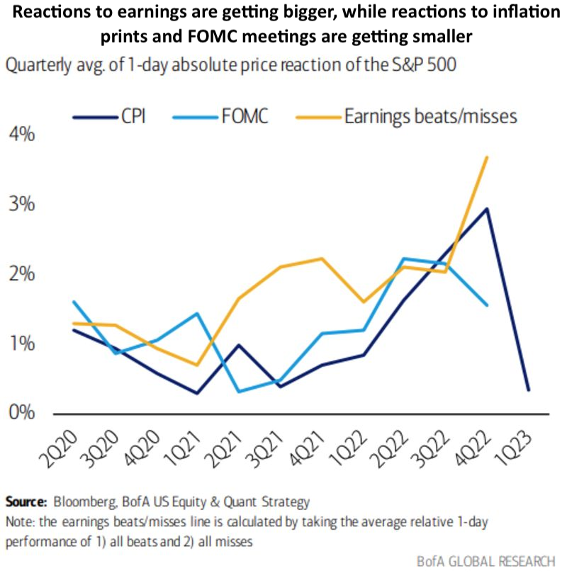It’s showtime baby! As many of y’all are aware, Q4 earnings season tends to be a bit longer than the others, as it takes a little while longer for companies to close the books on their year-end. We expect earnings to take the center stage going forward, where reactions to earnings have been getting bigger, while reactions to inflation/FOMC have been waning (Chart below). As many of y’all know, this is one of our core themes moving forward: “Inflation to Growth Frustration”.