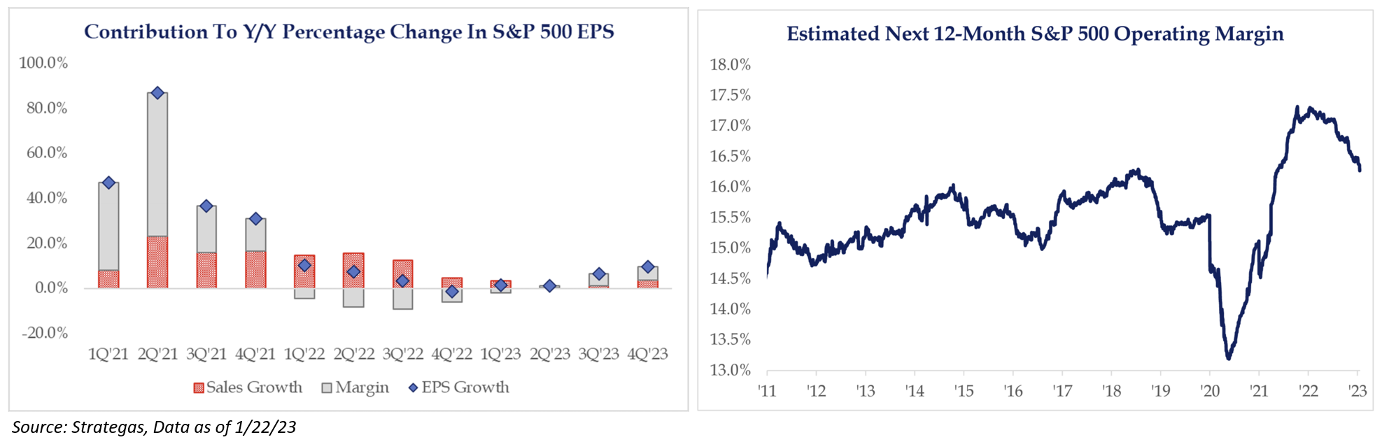 Our Biggest Worry: We expect tighter monetary conditions to exist for some time. This is likely to have a continued and negative impact on companies’ ability to expand operating margins. While the “money illusion” can result in higher levels of nominal earnings and make recession-related percentage earnings declines appear less severe than they would in low inflation regimes, contracting operating leverage in combination with tighter financial conditions has historically led to lower earnings and earnings growth.