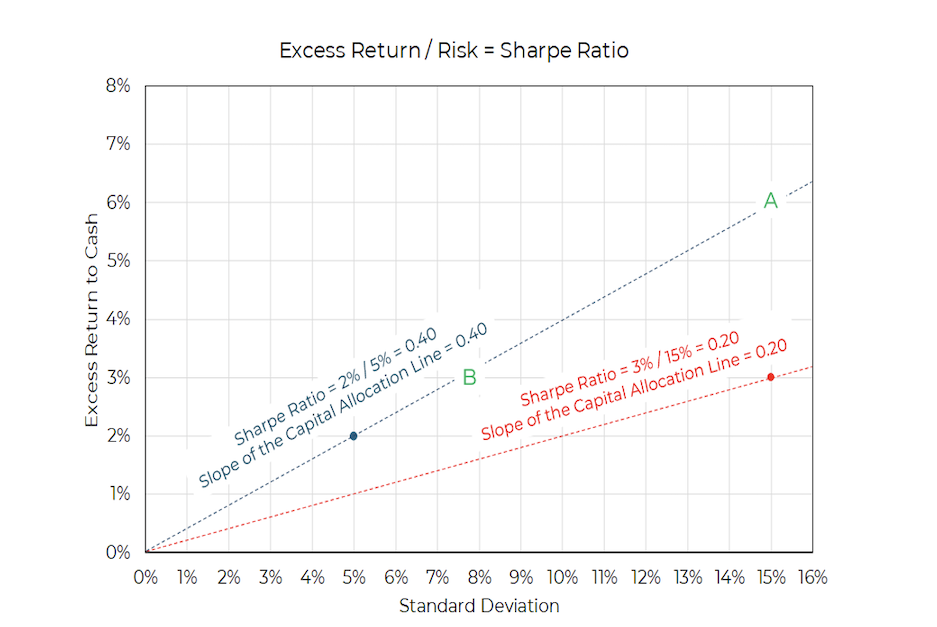 However, by leveraging this strategy (i.e. ramping up its excess return and risk), the investor can optimize their return-to-risk ratio along the dotted capital allocation line. This allows them to achieve either (A) a much higher 6% excess return over cash with a similar risk to stocks, or (B) a similar 3% excess return over cash with significantly less risk than stocks.