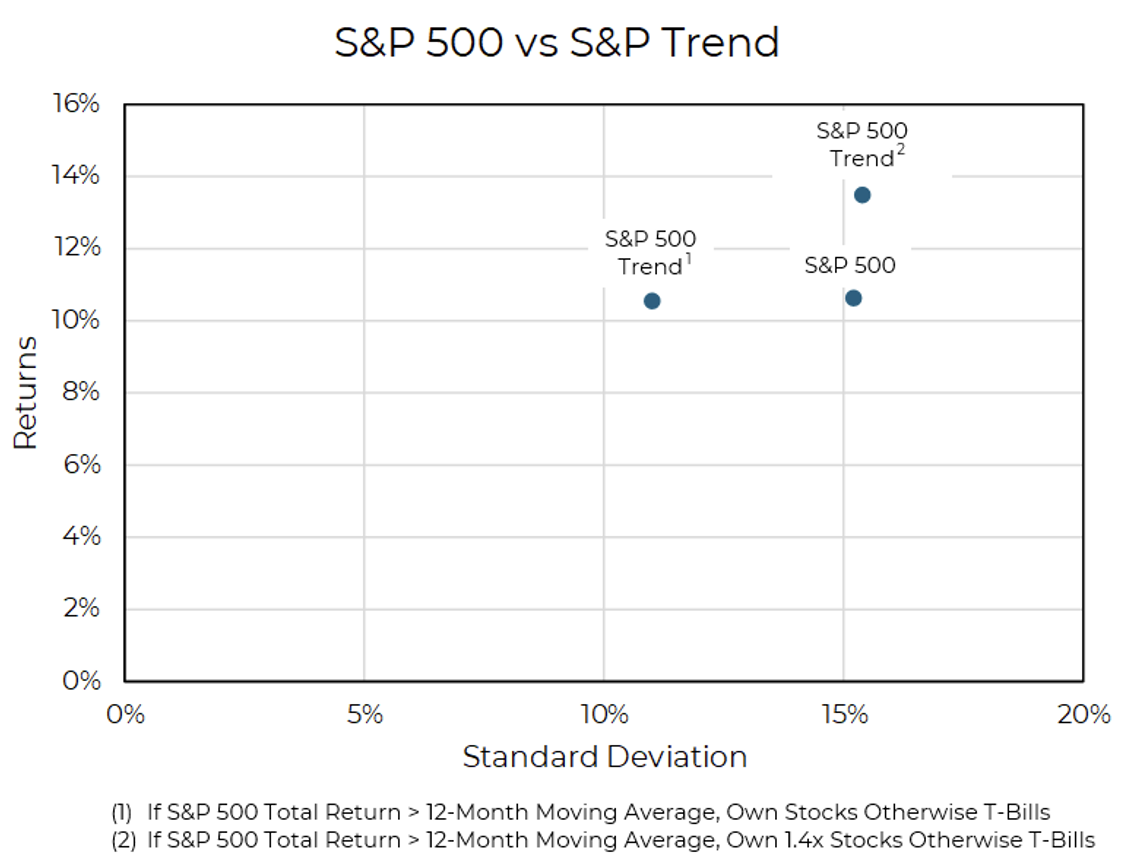Using this information to make allocation decisions, an investor choosing to own stocks only when markets were in an uptrend were rewarded with returns in line with the broader market over a 30-year period, but with less risk. However, an investor choosing to leverage exposure to the S&P 500 during uptrending markets may have ended up with higher returns with the same level of risk.