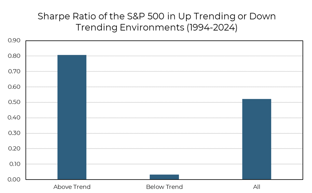 The S&P 500, for instance, has a clear bifurcation in Sharpe Ratio depending on whether the market is trending higher or lower.