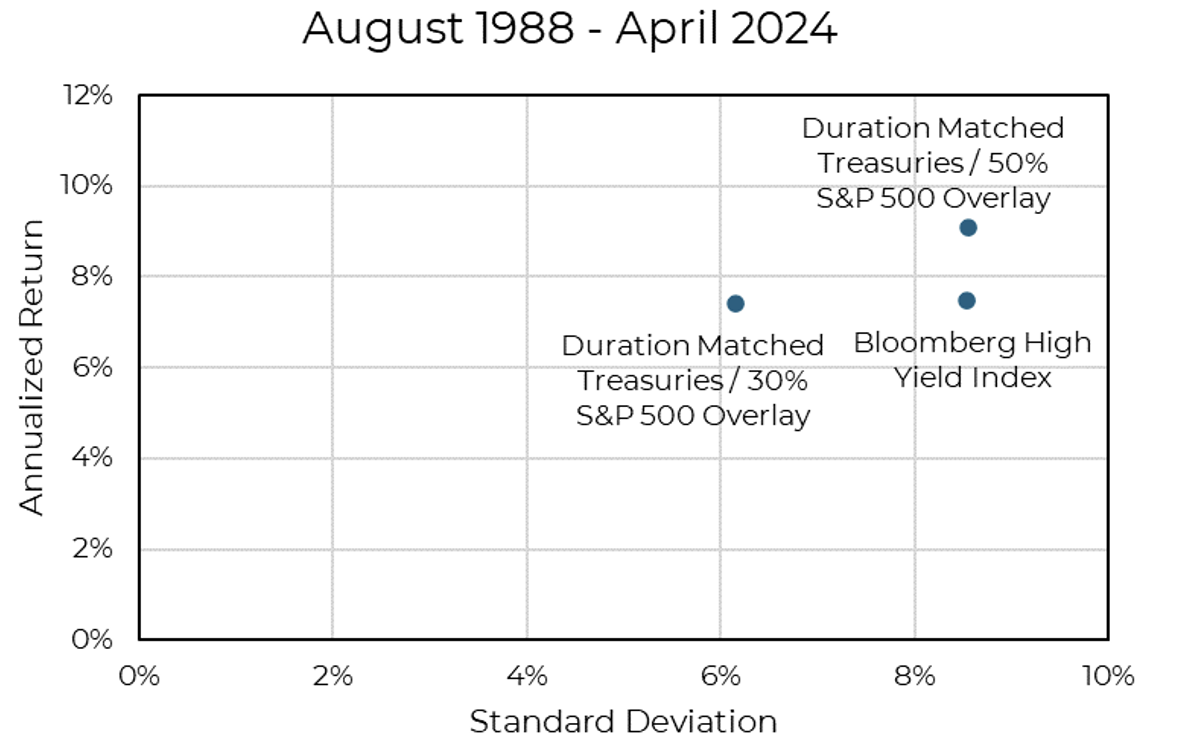 The chart below shows the historical return and risk of an allocation to the Bloomberg High Yield Index, alongside two return series that combine Treasuries (with a similar duration as the Bloomberg High Yield Index) with an overlay of S&P 500 returns at various notional values.