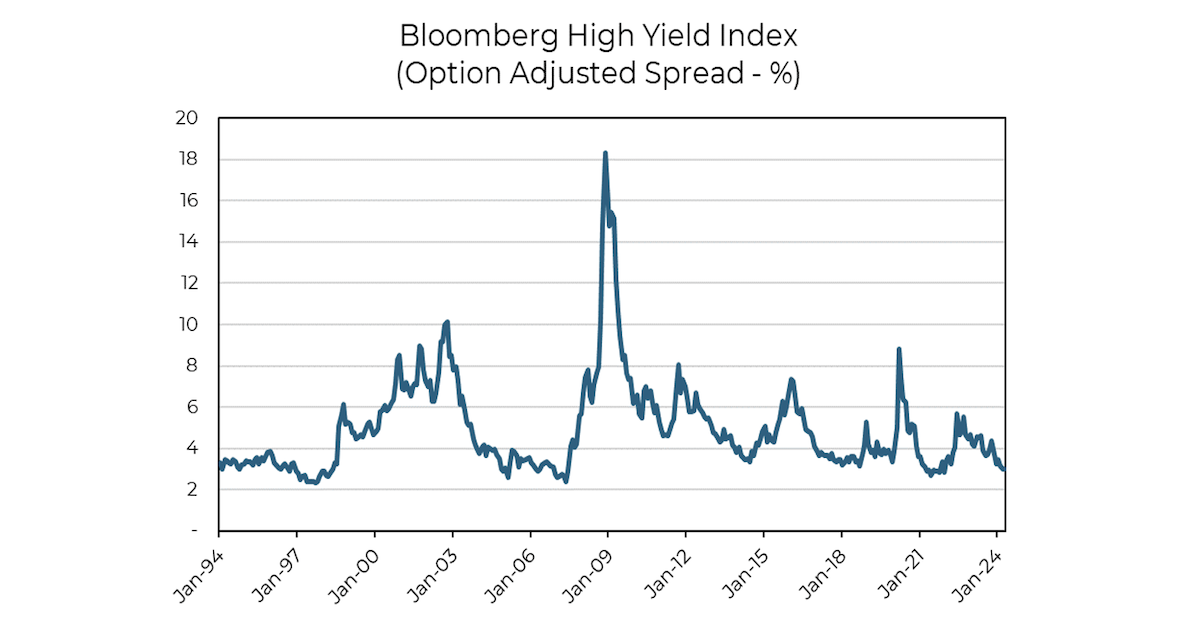- Varied Incremental Yield (i.e. Spread): Current spreads of high-yield bonds are near record low levels, meaning investors are compensated less than typical for taking on this risk.