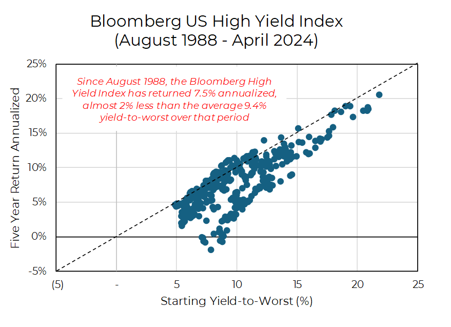 When analyzing historical returns, it becomes evident that traditional high-yield bonds are unlikely to provide a return that consistently matches the yield offered. At a current spread to Treasuries of just above 3%, history suggests they may not outperform higher-grade bonds.