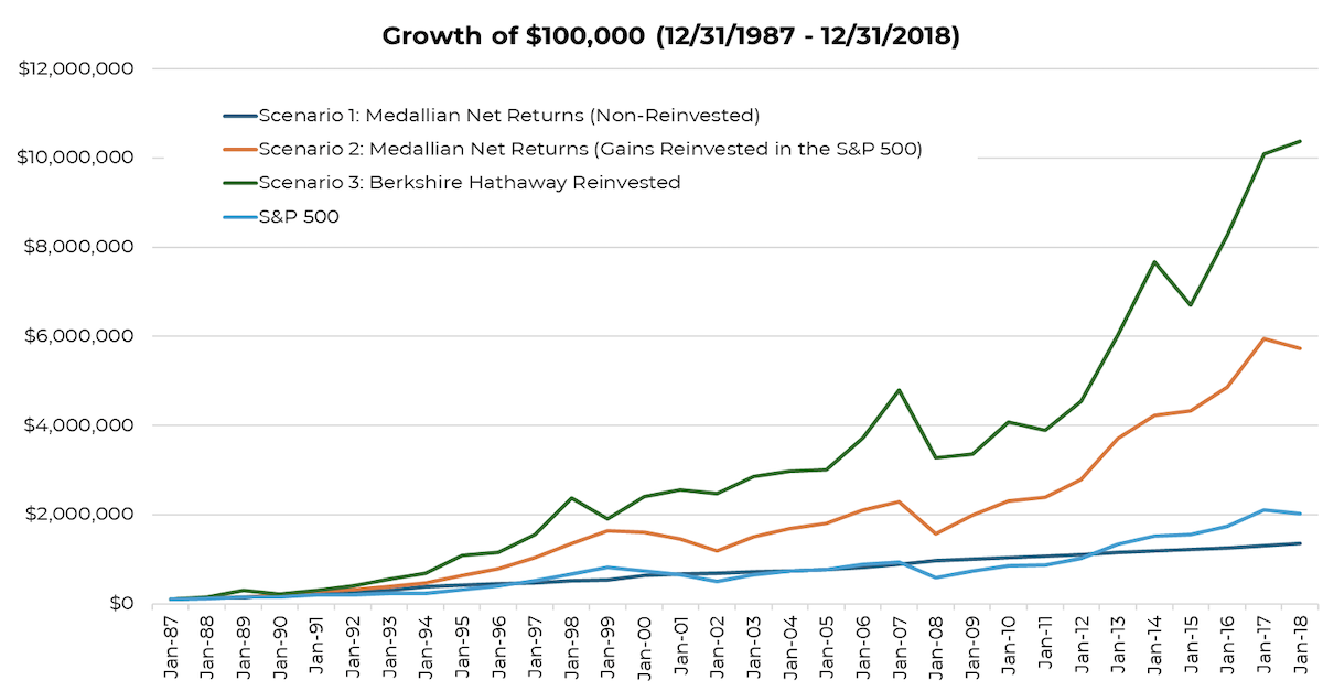 In reality, an investor has the opportunity to redeploy the capital (i.e. the $40,000 coupon) into something like equities. Over that 31-year period, the S&P 500 compounded at a much lower (but not so bad) return of 10.18% annualized, thus an investor starting with $100,000 in the Medallion Fund that swept the returns into the S&P 500 would have ended up with a whopping $5.7 million (compared to just $2 million if invested solely in the S&P 500).