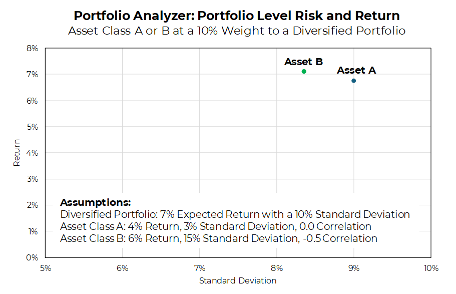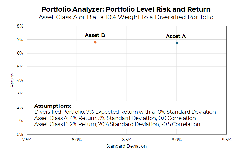At first glance, the choice might seem obvious. After all, Asset A provides a higher return with materially lower risk and has no correlation to the diversified portfolio. But there’s much more to consider.