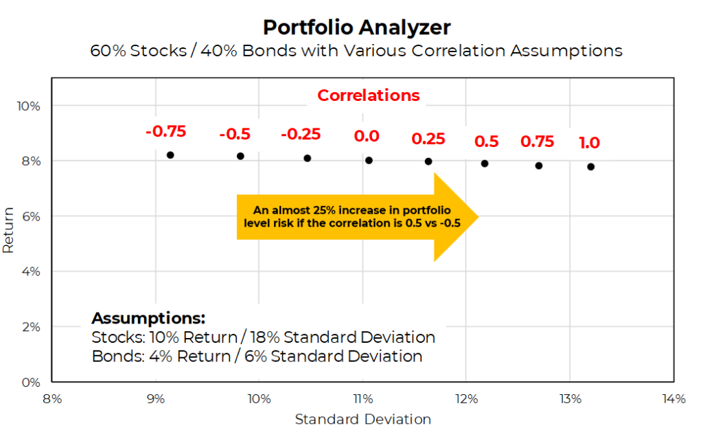 For example, contemplate the return and risk at the portfolio level for a 60% stock and 40% bond allocation, assuming consistent return expectations in each scenario but with different correlation assumptions. If the correlation between stocks and bonds transitions from -0.5 to 0.5, the portfolio’s standard deviation increases by nearly 25%.