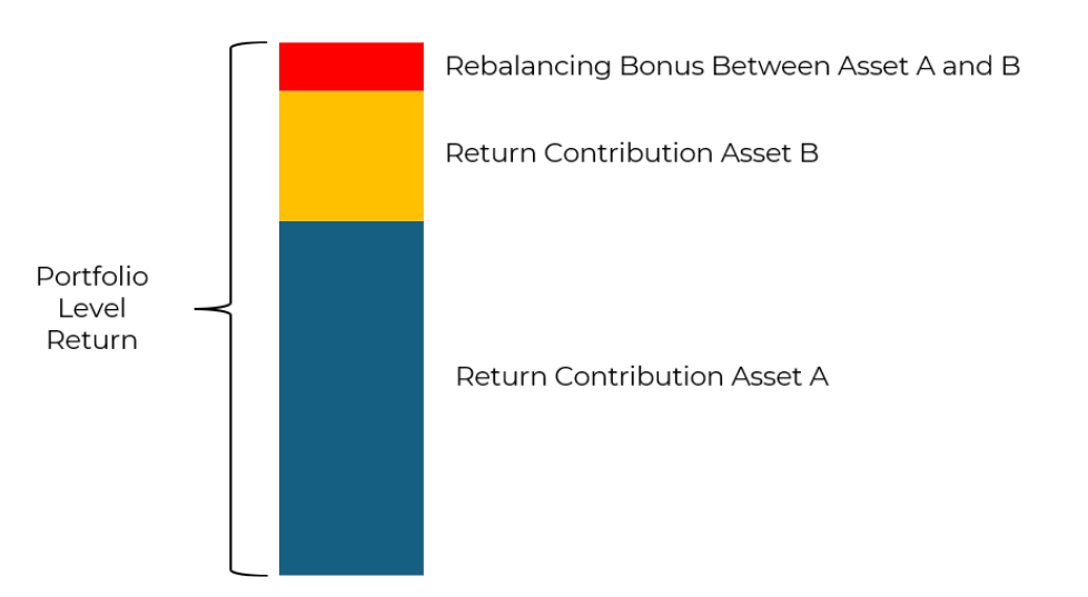 In simple terms, a rebalancing bonus is the reward an investor receives for re-adjusting diversified investments over time. In other words, the rebalancing bonus is how much incremental return a diversifier adds to portfolio-level returns, above and beyond what the holdings return on their own at allocated weights.