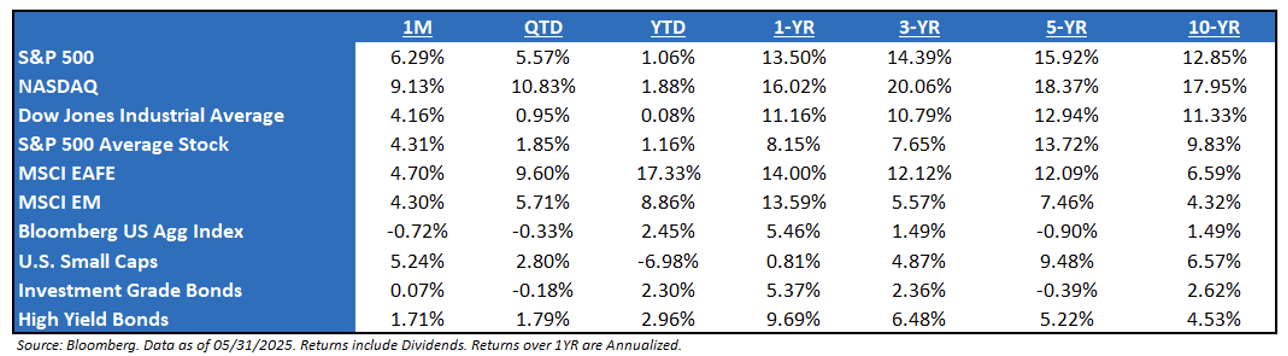 Market Recap – May 2025: To some, it may feel miraculous that the S&P 500 is now positive on the year – which was a new development during the month. March and April should be categorized as having apocalyptic soft data, which is also known as survey data, but this information has simply not transitioned into the hard data, a.k.a. realized statistics. Given this, alongside a very strong earnings season, the market had an unbelievable May. Investors do need to take note that international equities, specifically in EAFE, have outperformed during the market’s downside, but also the upside. With strong equity returns, the market had to look somewhere else for some pessimistic information and that was in the form on longer-dated Treasuries, which took in on the chin due to worries about the U.S. debt load. Overall, a market that is grasping for the earnings impact of tariffs and the yield impact of the Big, Beautiful Bill continues, and likely will continue for several more weeks