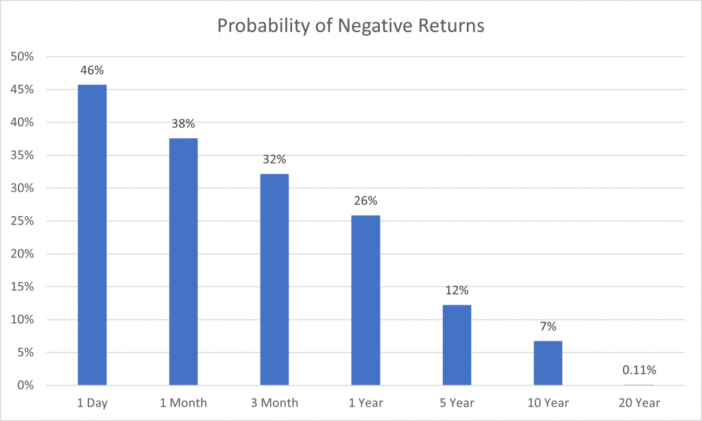 In our view, investors also tend to focus too much on the short-term “noise” in the market. There is usually great deal of variability in the day-to-day, with different economic, geopolitical, and company-specific news constantly moving markets. We believe the best method for loss avoidance is to expand your time horizon. Let’s take another look at the numbers: