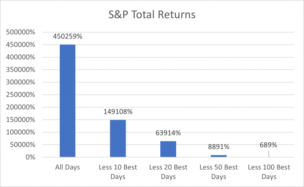 If you had missed just the 10 best days in the market, a mere 0.04% of trading days, you would only have $14,920,820. That is a whopping $30 million less from missing just the 10 best trading days! It logically continues to get worse as you exclude more of the best days. For example, if you missed the top 100 days, only 0.43% of total trading days, you would only have $78,929, more than $44 million less than if you had stayed invested.